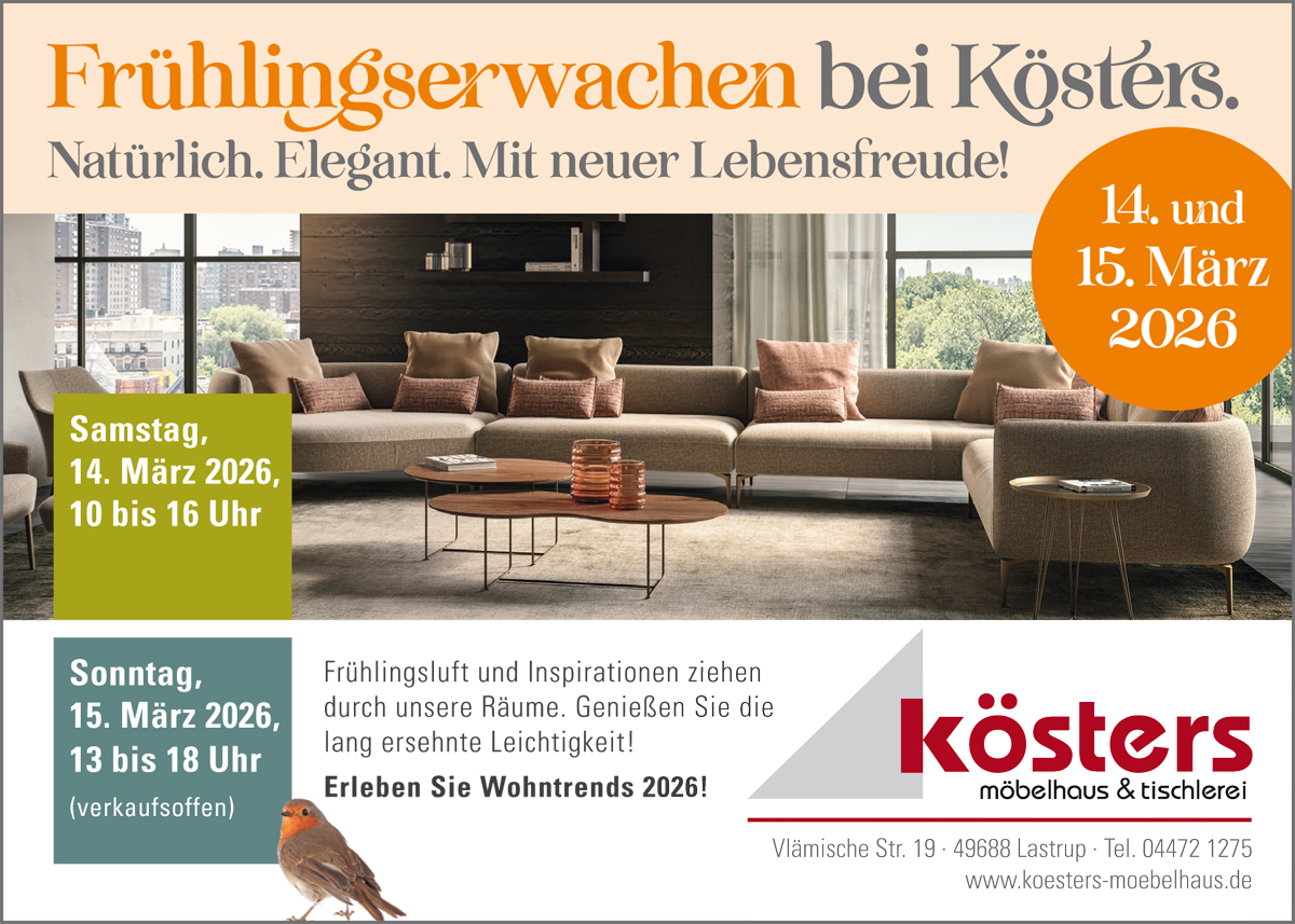 „Frühling lässt sein blaues Band wieder flattern durch die Lüfte …“ – wenn Eduard Mörikes berühmte Zeilen den Wechsel der Jahreszeiten ankündigen, hält auch bei Kösters Möbelhaus & Tischlerei der Frühling Einzug. Beim „Frühlingserwachen“ am 14. und 15. März präsentiert das Einrichtungshaus in Lastrup die aktuellen Wohntrends 2026.